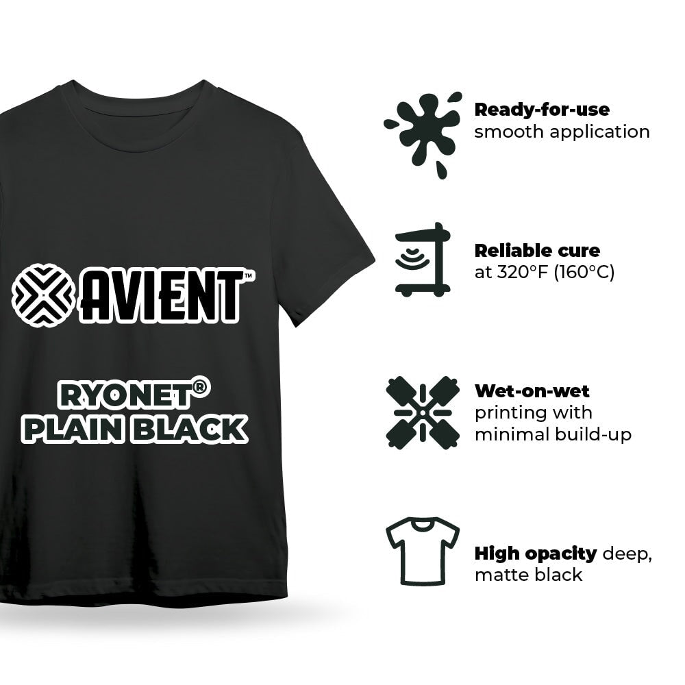 Avient Ryonet Plain Black is a high-performance plastisol ink built for screen printers who need dependable results in high-volume production. The word "Plain" in the name does not mean low quality. It simply means no gimmicks, no unnecessary extras, just a solid and consistent black ink that gets the job done. Formulated for high production, automatic presses, it offers smooth printability, deep matte color, and reliable performance under pressure. This ink is all about delivering professional results with efficiency and ease.