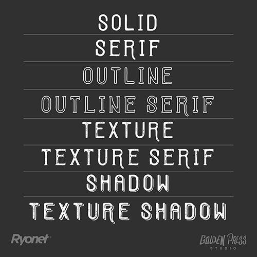• Includes eight different styles - Solid, Serif, Outline, Outline Serif, Texture, Texture Serif, Shadow, and Texture Shadow.