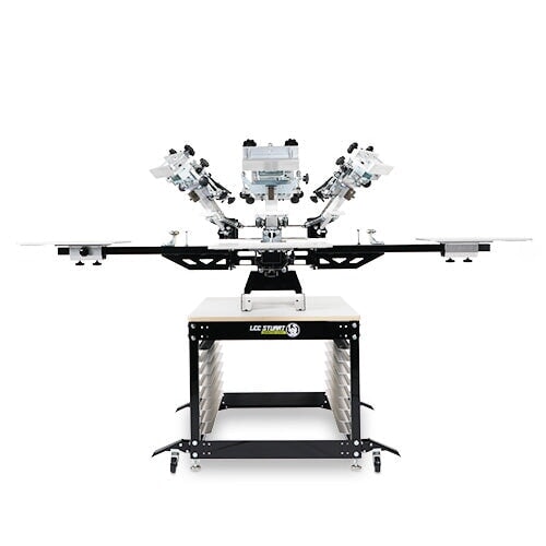 Put in the work with the Riley Hopkins® 250 Lee Stuart Edition Screen Printing Combo. In this set of equipment, you'll be equipped with a Riley Hopkins® 250 Press and Riley Hopkins® Multi-Station Press Cart with Pivot Casters. You'll be unstoppable with the press's high-tech features like heavy-duty roller registration gates, aluminum tilt lock knobs, and pre-notched aluminum platens. The press cart provides a rock-solid foundation thanks to the double-reinforced top and kick-down pivot casters.