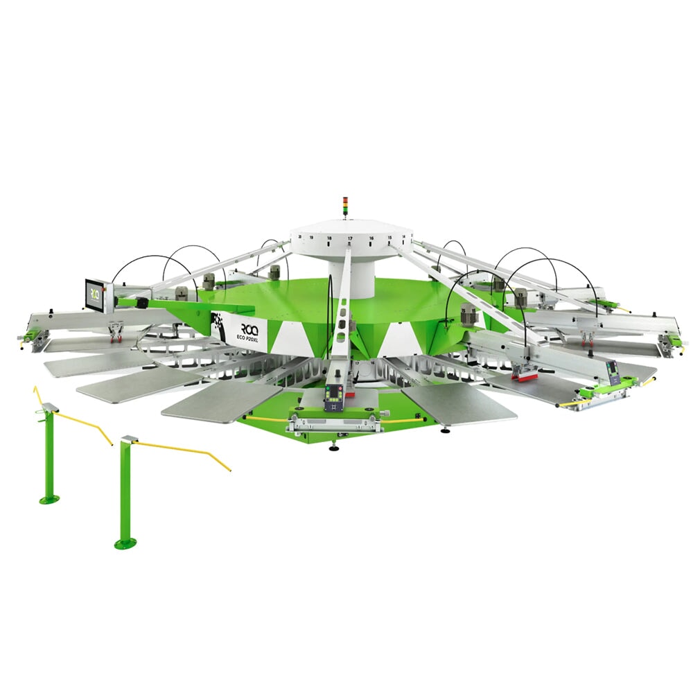 The ultimate screen printing machine. Fast, versatile and attractive. The ROQ ECO makes you want to be a better screen printer just by looking at it! Available from a 10 to 18 color format. The RoqPrint ECO Automatic Screen Printing Press integrates the ultimate in innovative technology. With consistent high production speeds, durable chassis for a very long life of production and integrated special effects features such as automatic flock and automatic foil there isn't much the ECO can't do when it comes to screen printing.