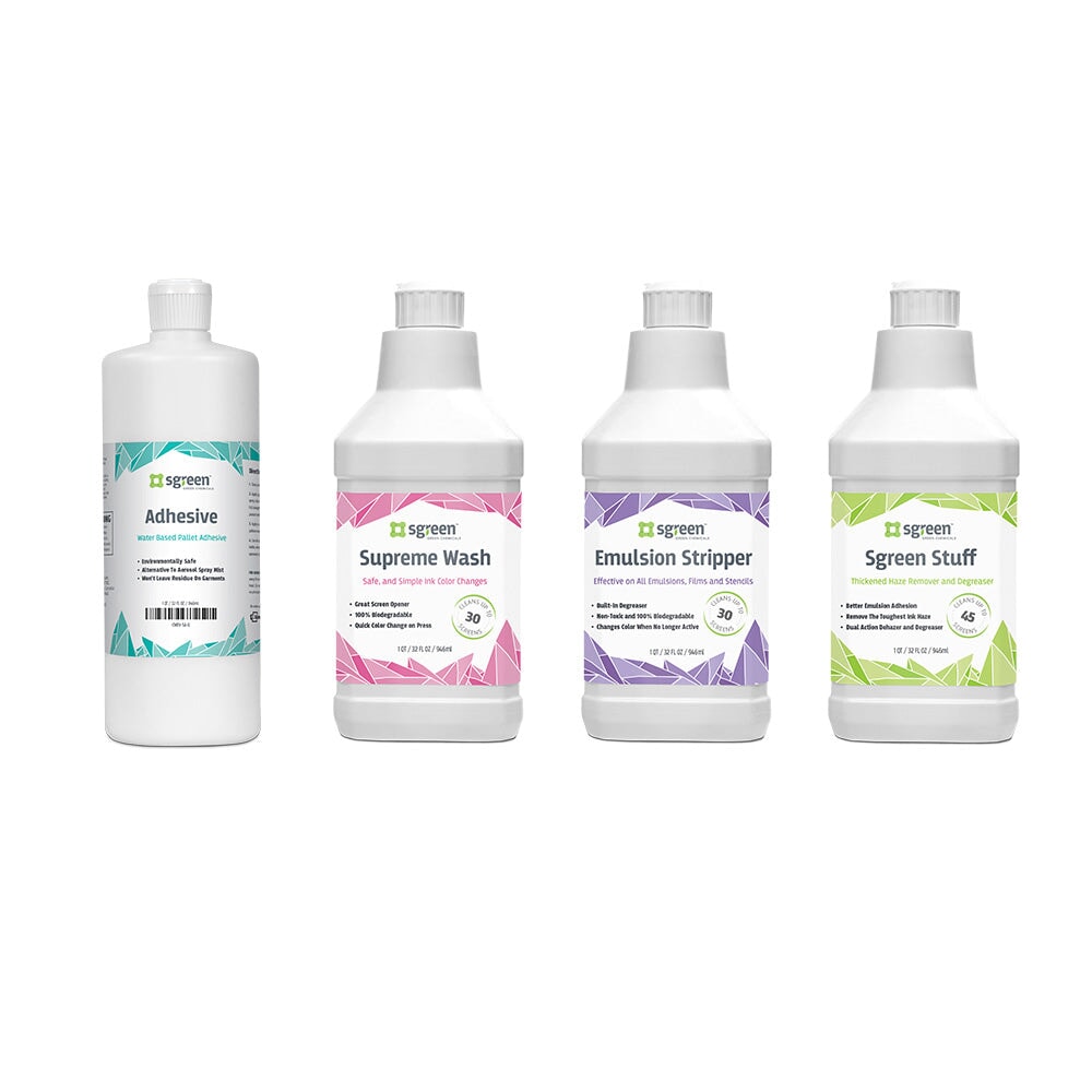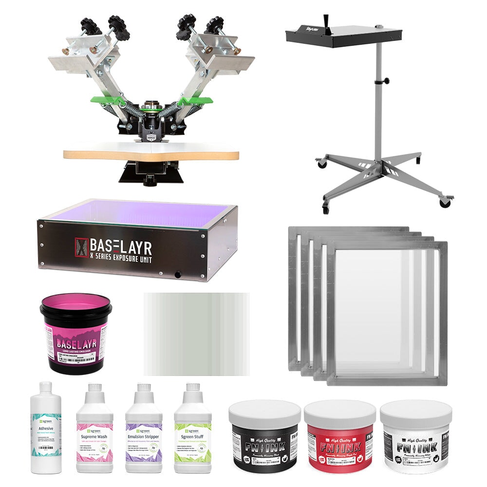 The kit has everything you need — a press, flash dryer, exposure unit, screens, squeegees, inks, chemicals, and more. Loaded with top-notch equipment and supplies from brands like Riley Hopkins®, Baselayr®, Sgreen®, and FN-INK™, you can count on producing high-quality prints right from the start.