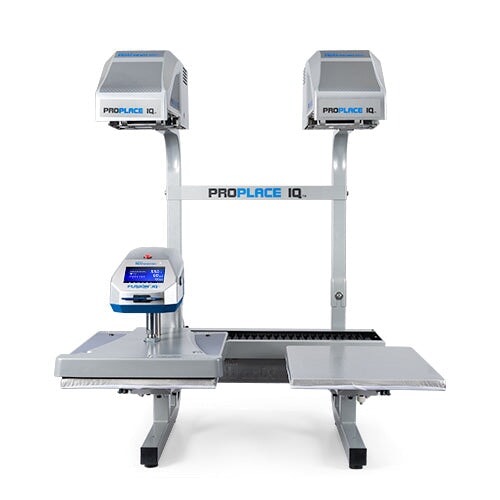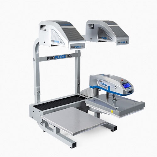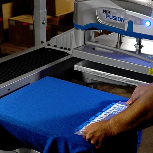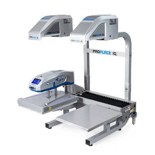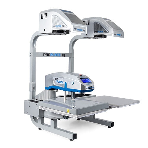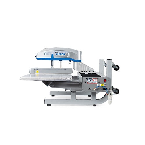 The Dual Air Fusion IQ® Heat Press is built for the ultimate heat printing efficiency. This heat transfer machine provides the functionality of two Air Fusion IQ® heat presses with smooth, effortless operation controlled by the push of a button and tap of a foot pedal. The upper platen moves between heat printing stations, allowing operators to prepare garments on one station while the other is being pressed.