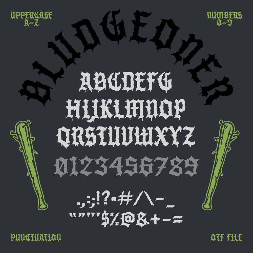 Bludgeoner is mainly an all uppercase font, but we've included lowercase variants that have lost the outer spurs to give you more creative flexibility.